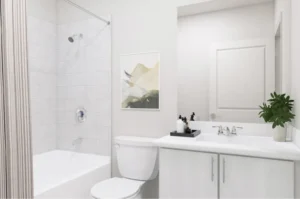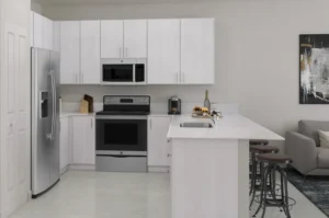 - Acabados Premium: Electrodomésticos de acero inoxidable, mesadas de cuarzo y gabinetes de 36″.