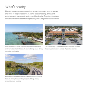 La zona tiene infinitas comodidades y atracciones disponibles para sus residentes, incluida la recreación al aire libre en parques locales, acceso a los Cayos de Florida y entretenimiento en Homestead Speedway.