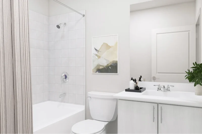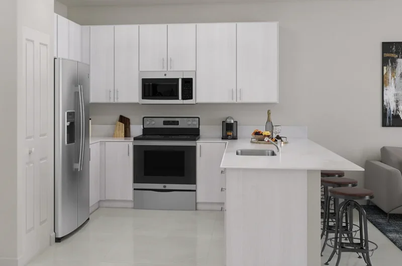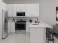 - Acabados Premium: Electrodomésticos de acero inoxidable, mesadas de cuarzo y gabinetes de 36″.